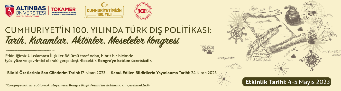 “CUMHURİYET’İN 100. YILINDA TÜRK DIŞ POLİTİKASI: TARİH, KURAMLAR, AKTÖRLER, MESELELER” Kongresi Altınbaş Üniversitesi Uluslararası İlişkiler Bölümü tarafından, 4-5 Mayıs 2023 tarihlerinde hibrit bir biçimde (yüz yüze ve çevrimiçi olarak) gerçekleştirilecektir.
