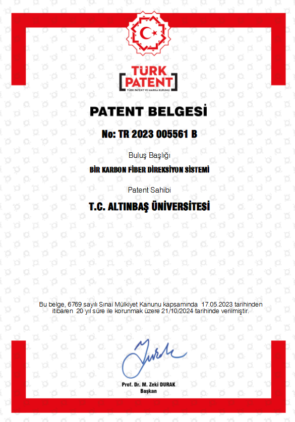 Mühendislik ve Mimarlık Fakültemizden öğretim üyelerimiz Doç. Dr. Süleyman Baştürk ve Dr. Öğretim Üyesi Onur Ağma ile buluş ekibinden öğrencileri Haluk Şenyurt ve Ahmet Kasap’ın geliştirdiği, TR2023/005561 numarasıyla işlem gören “Bir Karbon Fiber Direksiyon Sistemi” başlıklı patentimiz, 21 Ekim 2024 tarihinde tescil edilmiş ve 28 Ağustos 2025’te Türk Patent ve Marka Kurumu tarafından patent tescil belgesi verilmesiyle resmiyet kazanmıştır.