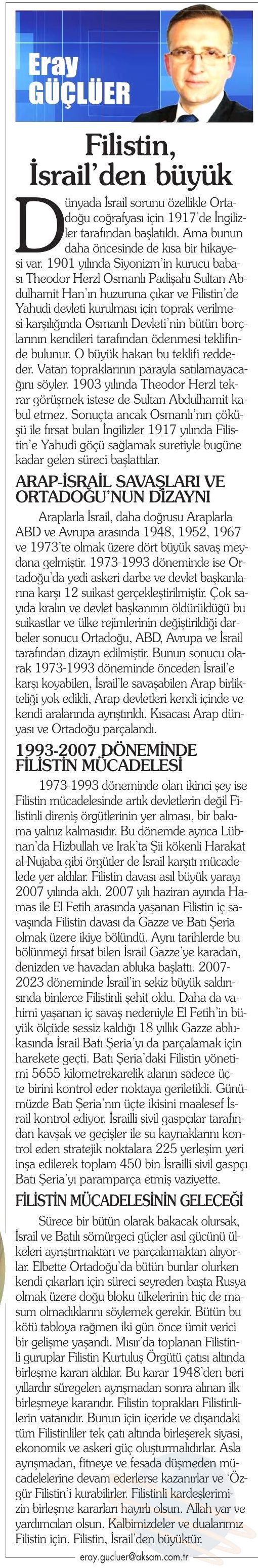 FİLİSTİN, İSRAİL’DEN BÜYÜK